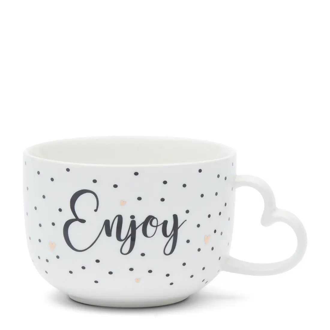 This soup bowl carries the clear message: ‘Enjoy!’ in elegant lettering which shouldn’t be a problem with this gorgeous bowl with remarkable details. White porcelain with features in black and gold decorate the bowl with its heart-shaped handle. The Enjoy Soup Bowl is part of a range of three different cups with matching soup bowls.