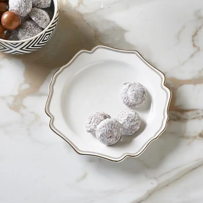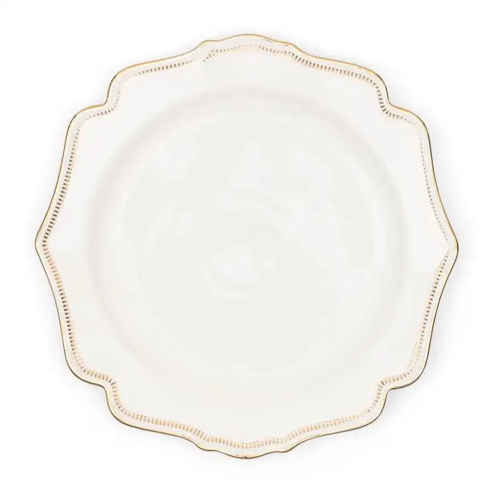 This is the side plate from the Glamour tableware series. This white plate of porcelain is a perfect way to serve side dishes. It features a remarkably beautiful wavy edge for a classic look. This porcelain plate comes decorated with golden details.