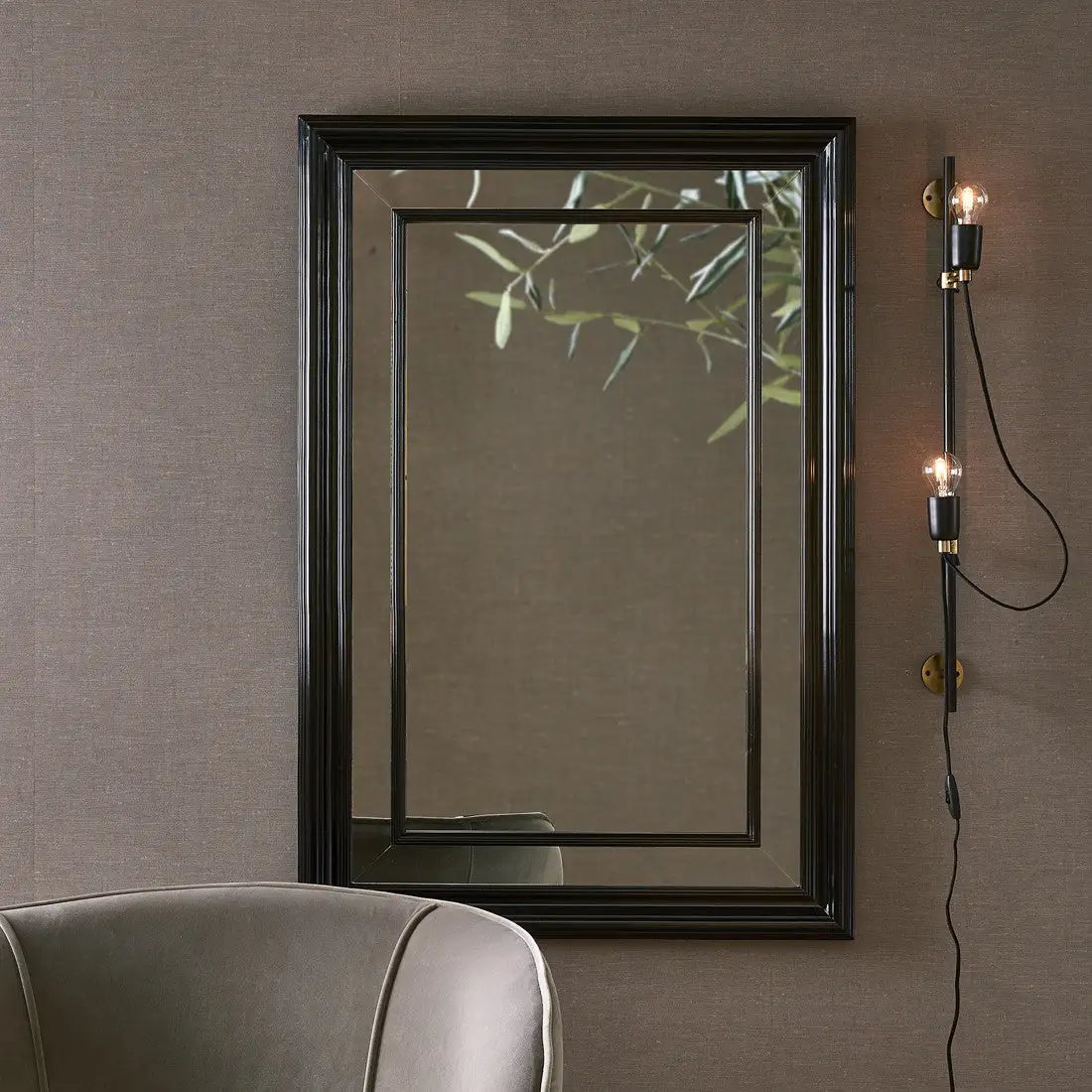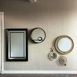 Hang this large mirror with its black classic frame on the wall or use it as a true eye-catcher on a mantle shelf. The surround of the frame is made with a delightfully sculptured edge and the mirror is deeply recessed.