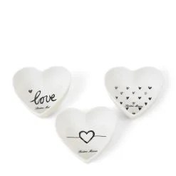 Taste the love! These porcelain bowls were hand-painted and decorated with cute designs. In one dish there are several small hearts, while in the other a somewhat larger heart in black paint was applied. The white bowls can be used to present nuts or other snacks.