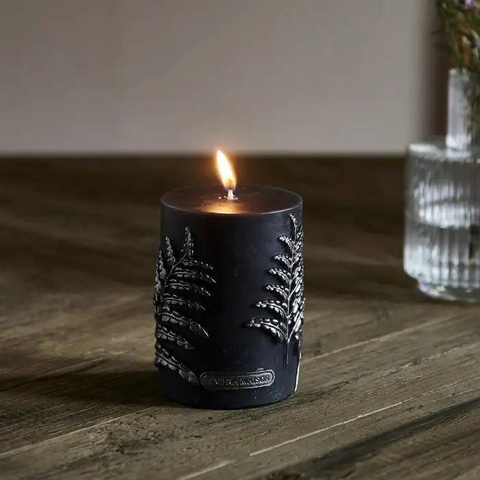 Thanks to its gorgeous relief of fern leave on the side, this is a remarkable block candle. The fern pattern features in our other home accessories as well, adding to the atmosphere boost of this candle. This round block candle is available in various sizes.
