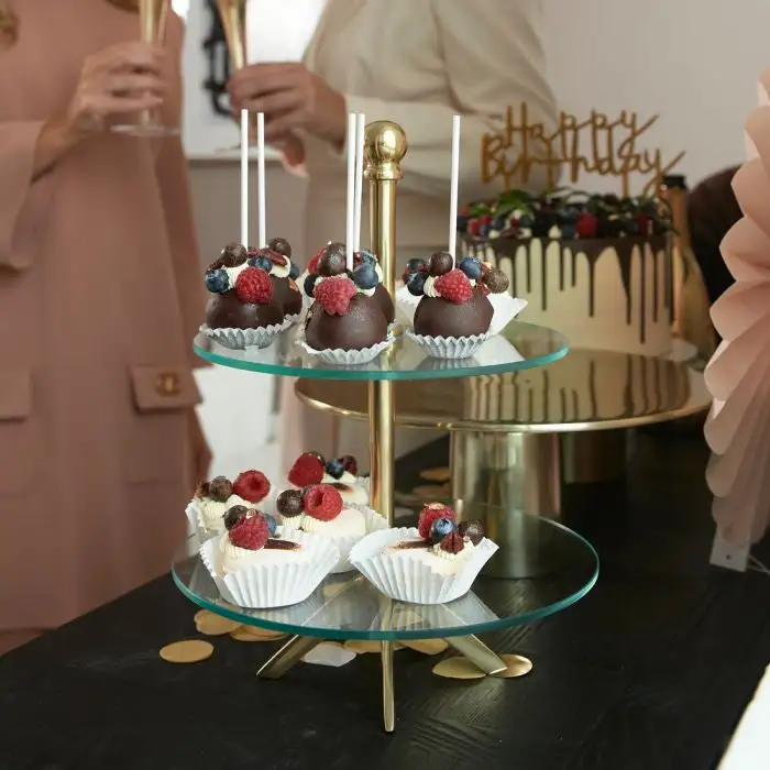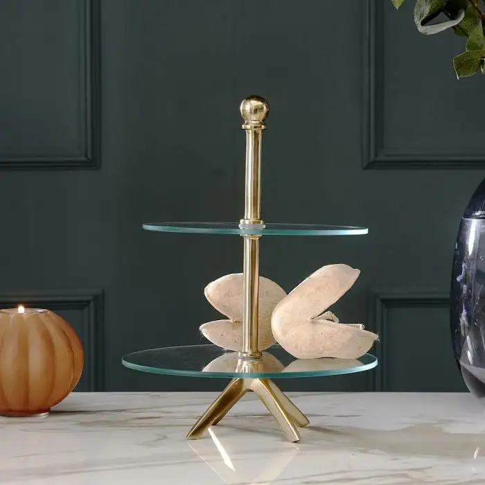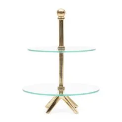 The Mirage Etagère 2 Layer is a refined etagère with two round plateaus. The plateaus are made of clear glass. The combination of the glass plateaus with the golden base and handle gives this etagère a chic look. Use the etagère for snacks or decorative material.