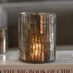 Original windlight made by hand. Wavy mosaic strips of slightly reflective glass give the glow of the tealight a special aura. Put a few of them together, and your cosy evening can go on forever. They come in two sizes, so you can combine them.