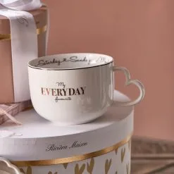 The My Day Everyday Favourite Soup Bowl is a porcelain bowl with a striking handle shaped like a heart. Made with white porcelain the bowl features lettering and decoration in black and gold on the inside and out.