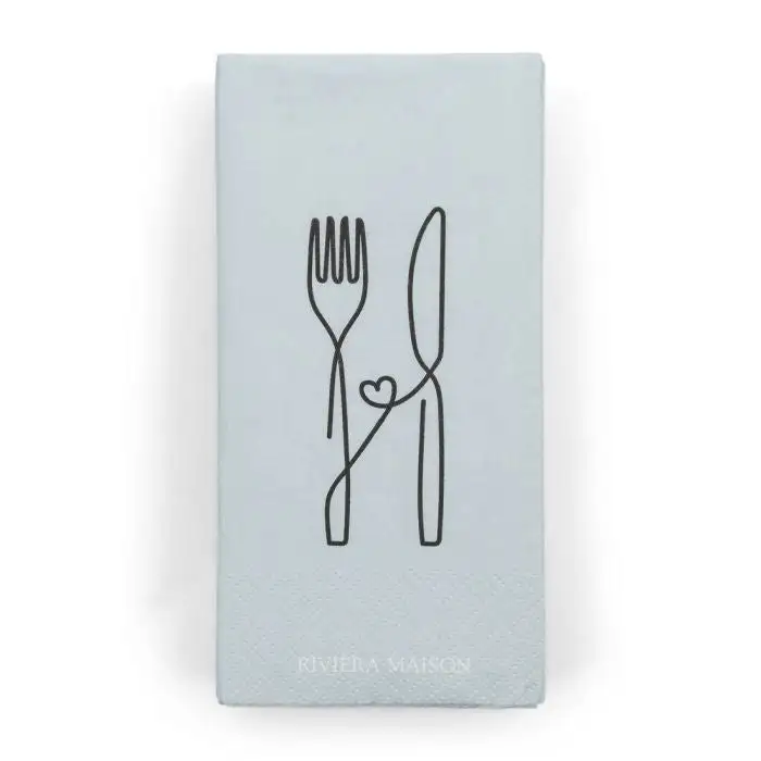 With this soft blue, rectangular napkin ‘Stylish Cutlery’ you can set your table elegantly and stylishly in the blink of an eye. This paper napkin has a subtle line drawing of a knife and fork connected by a heart. Nice for everyday use or just for a special dinner.