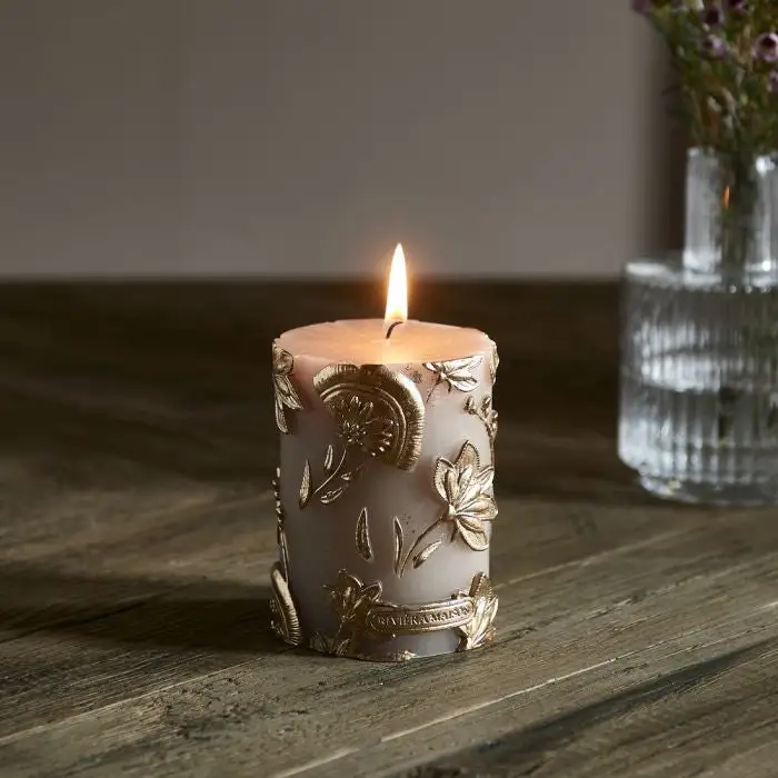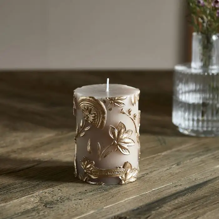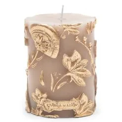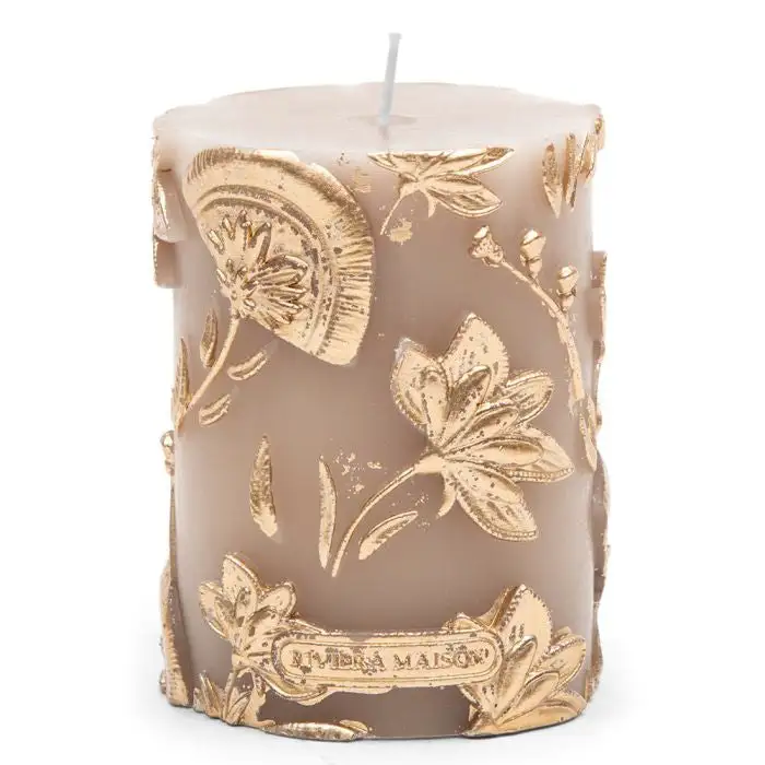 As in the other items from the Poetic Folk collection, we also see the fan-shaped flowers on this beautiful candle. The flowers are embossed on the pillar candle and finished with shiny gold colour. Available in different sizes
