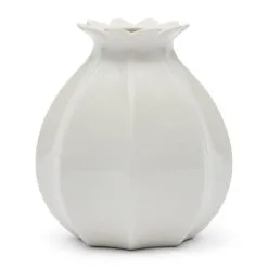 This white porcelain vase has a shape that distinctly resembles the seed bulb of a poppy with the flower just starting to open around the open neck. Itβs a very attractive vase and looks fine with sprays of flowers and leaves. The vase is available in different sizes.