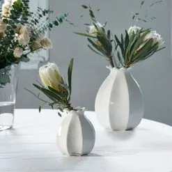 This white porcelain vase has a shape that distinctly resembles the seed bulb of a poppy with the flower just starting to open around the open neck. Itβs a very attractive vase and looks fine with sprays of flowers and leaves. The vase is available in different sizes.