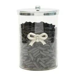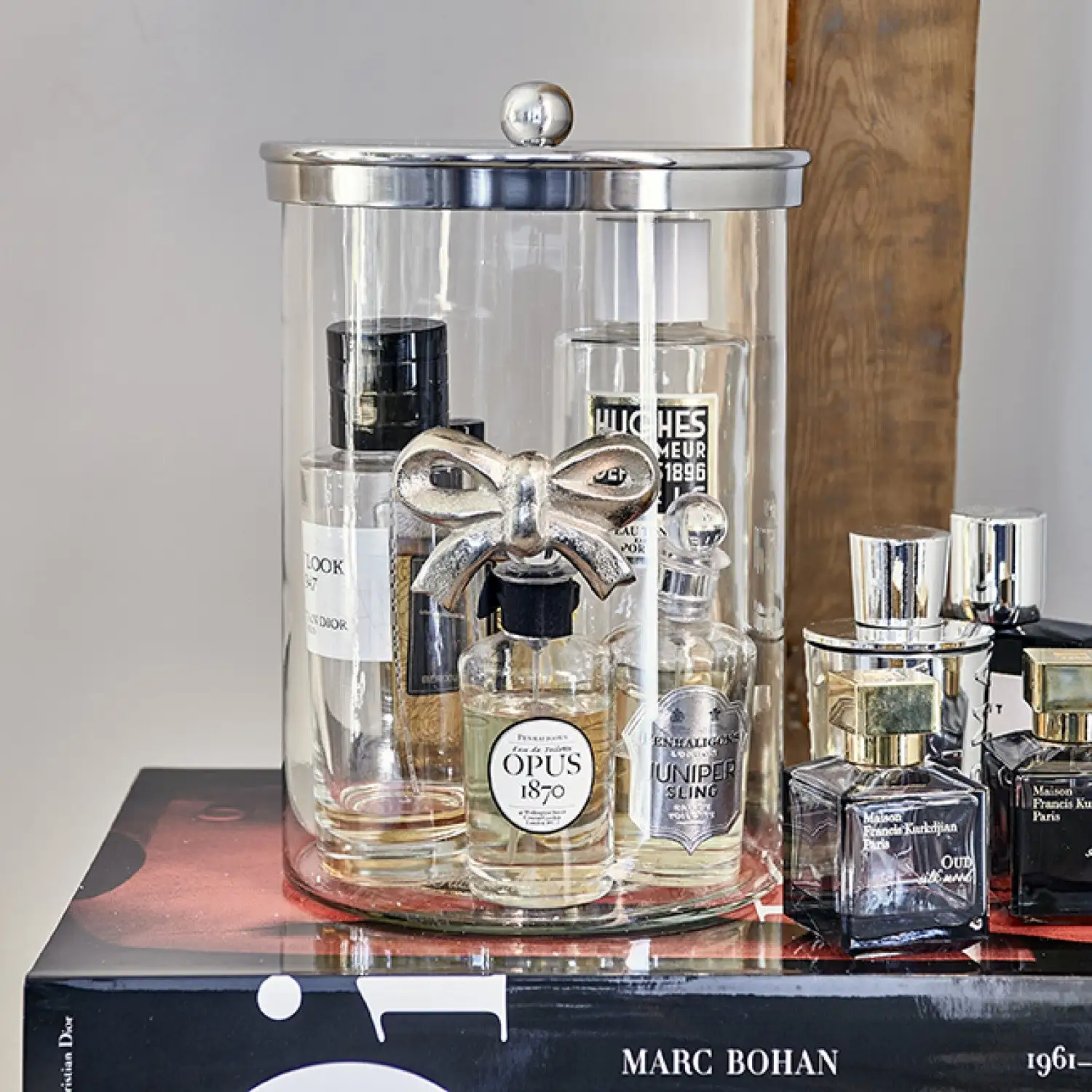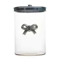The ‘Ribbon Metal Storage Jar’ is a glass storage jar with a subtle bow detail. The clear, mouth-blown glass offers a good view of the contents of the jar. The bow is made of shiny aluminum, which has also been processed according to traditional methods.