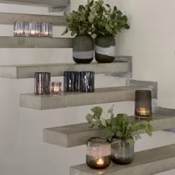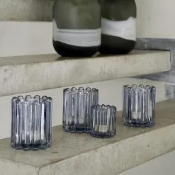 A ribbed glass tealight holder finished with quirky dots at the top. The thickness of the glass and ribs add a special effect to the reflection of the light. A tealight holder that will fit anywhere. A great Christmas gift or for yourself. 11 cm tall.