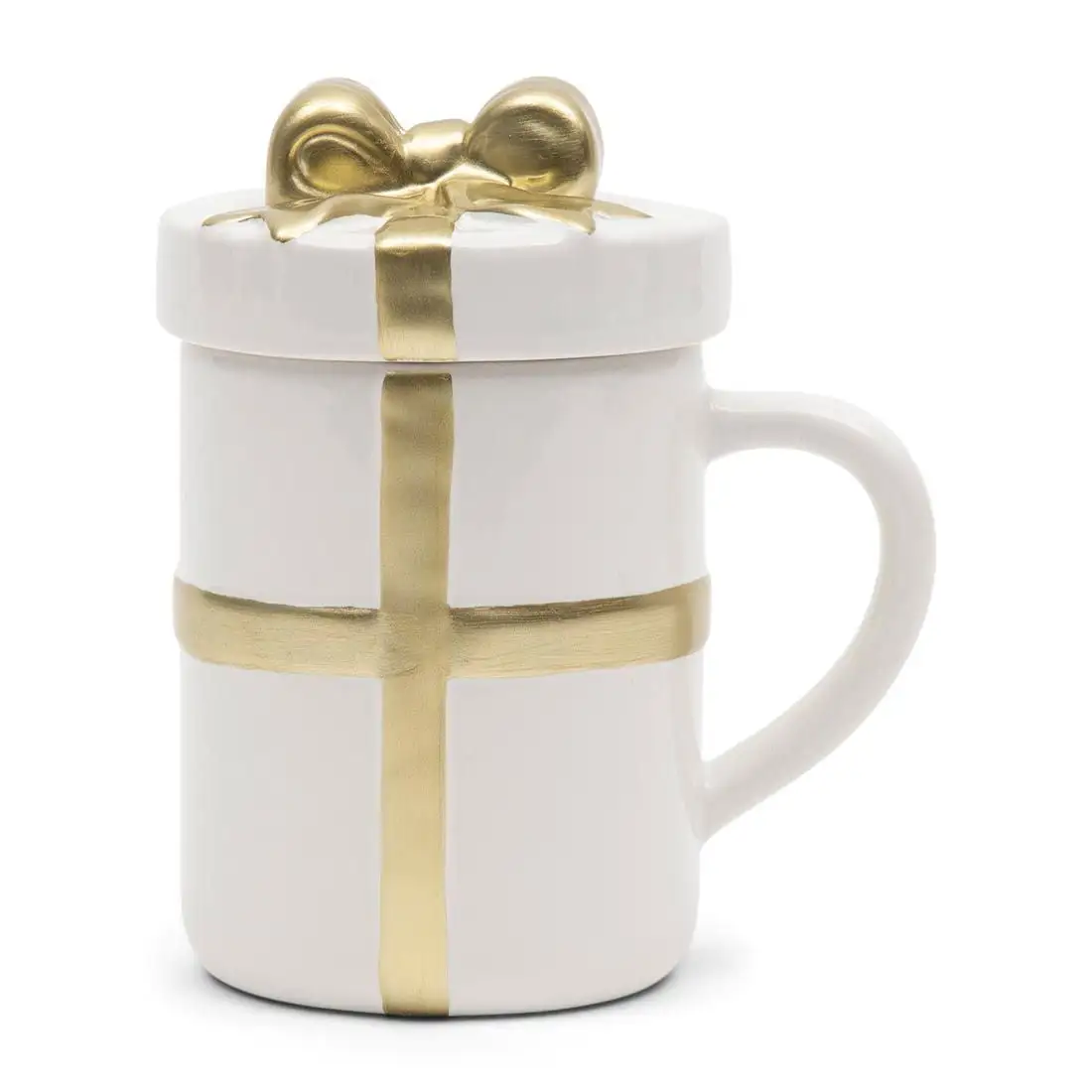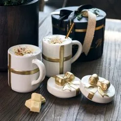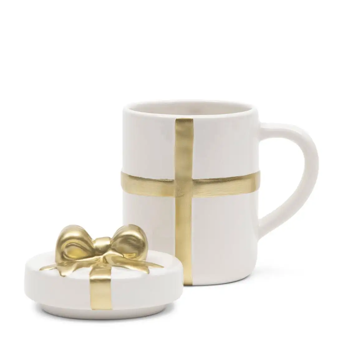 A mug that looks like a Christmas gift. Take the lid off the ‘gift’ to reveal your coffee, tea, coco or milk. A thick, gold-coloured ribbon with a bow decorates this porcelain mug. Drinking becomes a festive act.