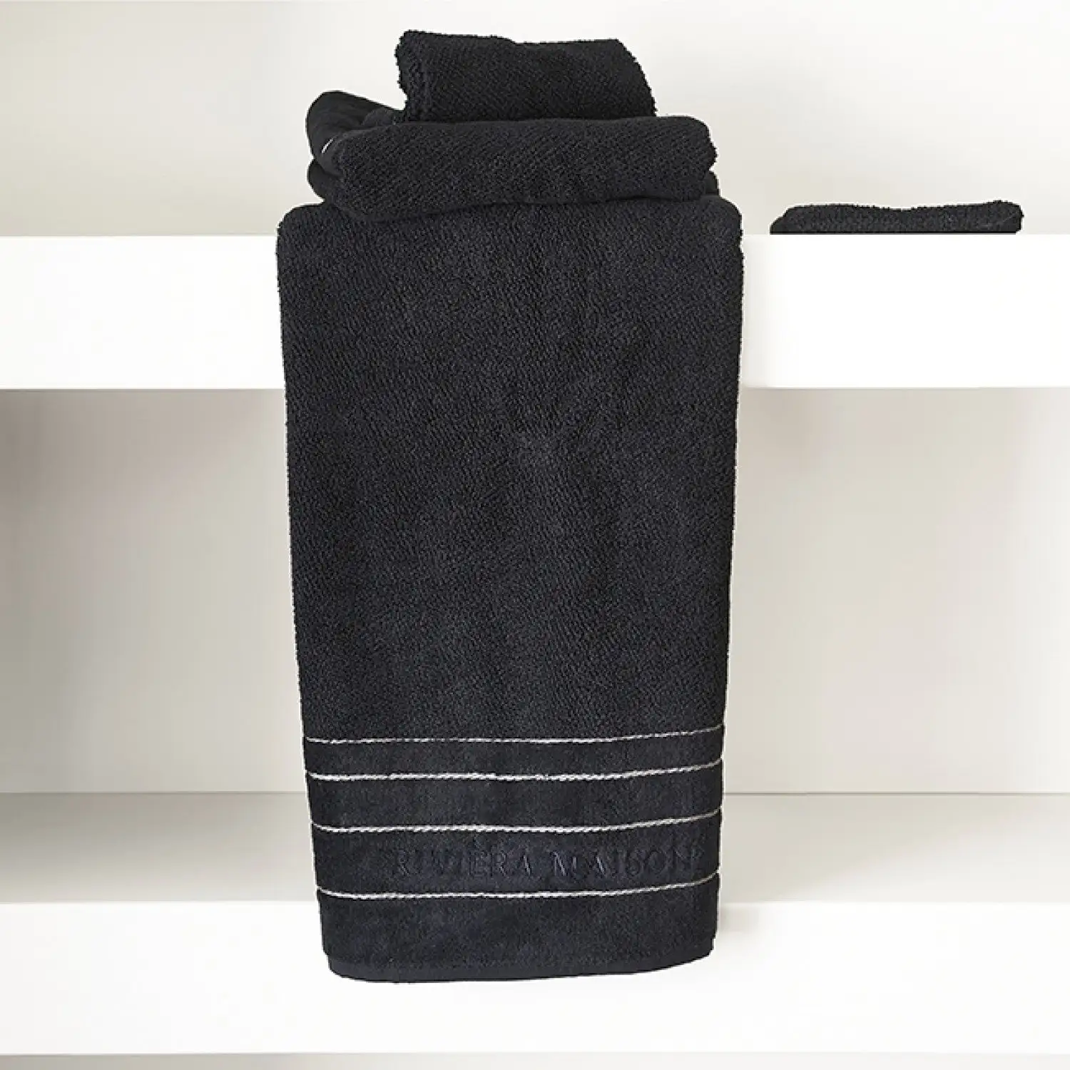 The new RM Elegant line combines high-quality cotton with a soft, modern look. This black RM Elegant Towel measures 140 x 70 centimetres, and has a gorgeously soft texture and a velvet border with decorative stripes and embroidery.