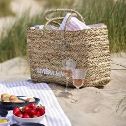 Handwoven from sustainable seagrass and with a sturdy cotton lining, this beach bag can be zipped closed to protect your belongings. A white tassel with our aluminium branding evokes a necklace, and our name embroidered in large white lettering on the side makes it stand out from the crowd.