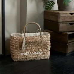 Handwoven from sustainable seagrass and with a sturdy cotton lining, this beach bag can be zipped closed to protect your belongings. A white tassel with our aluminium branding evokes a necklace, and our name embroidered in large white lettering on the side makes it stand out from the crowd.