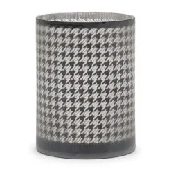 This glass lantern is 24 cm tall with a diameter of 18 cm, enough for a sizeable candle. Many hours of enjoying the subtle light, achieved by the pied-de-poule pattern. It took five layers of overlapping print to achieve this effect. A meticulous task!