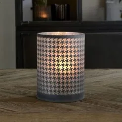 This glass lantern is 24 cm tall with a diameter of 18 cm, enough for a sizeable candle. Many hours of enjoying the subtle light, achieved by the pied-de-poule pattern. It took five layers of overlapping print to achieve this effect. A meticulous task!