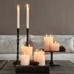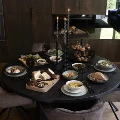 With its somewhat industrial look, this candle holder deserves a nice spot in your interior. Beautifully hand-twisted of aluminium and coated in black. This candle holder is 46 cm tall and 71 cm with a dinner candle. It is a prominent candle holder, so give it some space to enhance the effect. Also available in a smaller size.