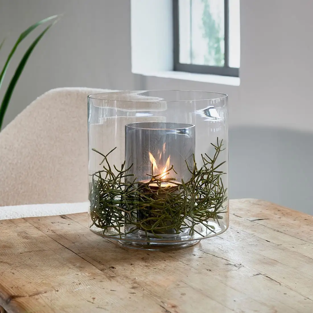 Place a pillar candle in the inner glass and decorations in the outer glass of this double hurricane to create a unique and attractive addition to your décor. Dried summer flowers, shells, driftwood or other decorations can give this hurricane a touch of extra allure.