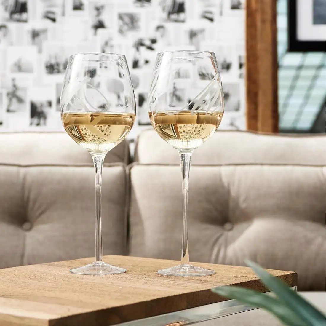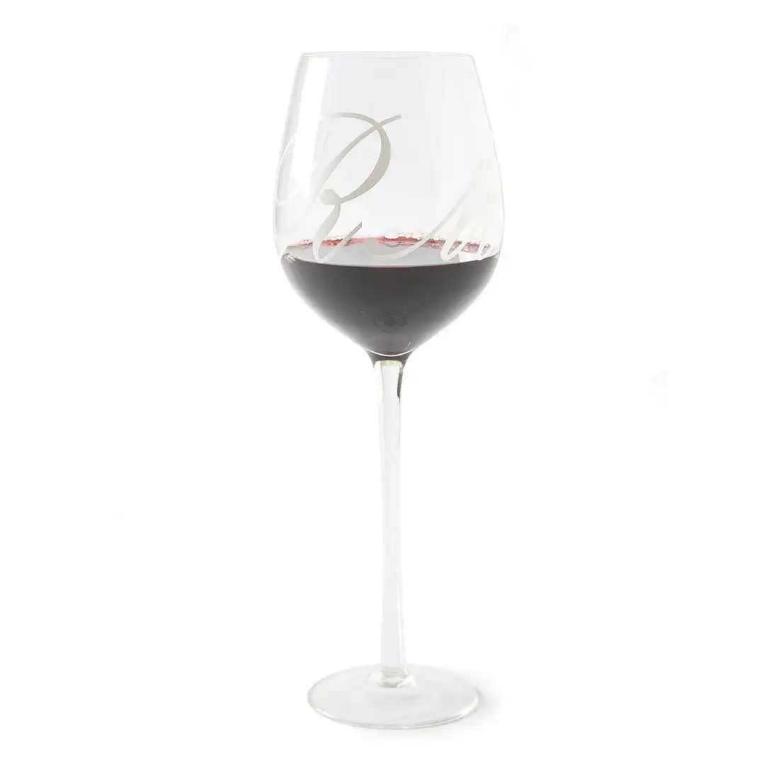 Wine glass with a tall stem engraved with the letters ‘RM’. Cheers!