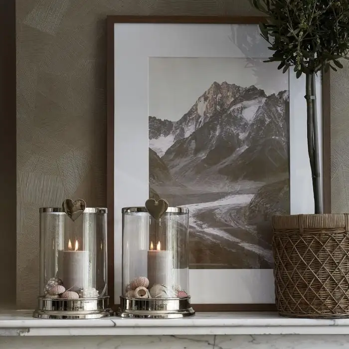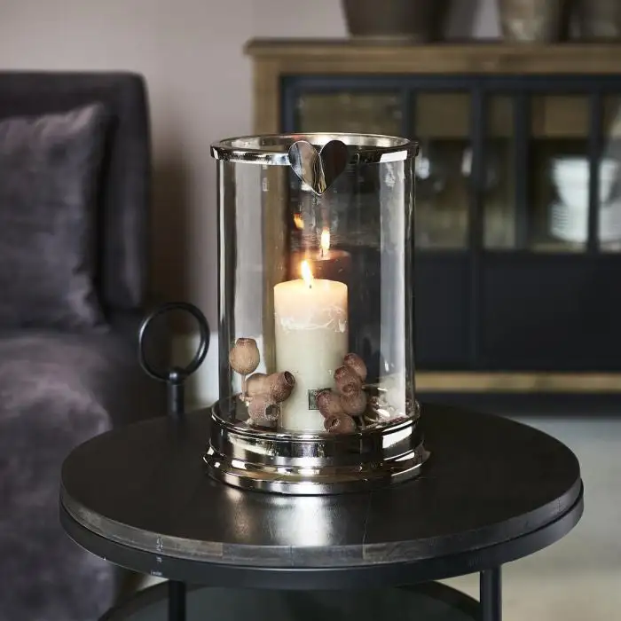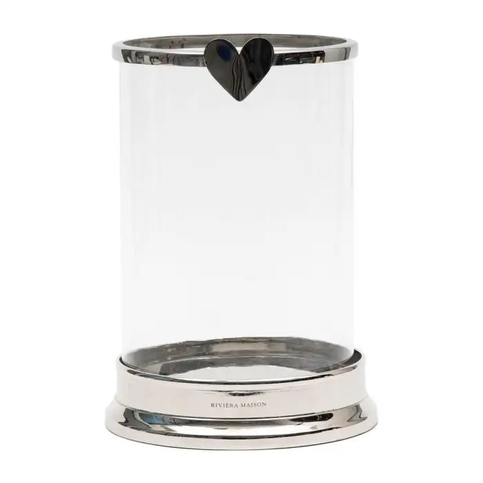 A large lantern on a base of slightly glossy metal. The rim on top is made of the same metal. Features a heart for some extra ‘love’. This lantern will fit a large block candle for many hours of enjoyment. With RM branding in the metal at the bottom.