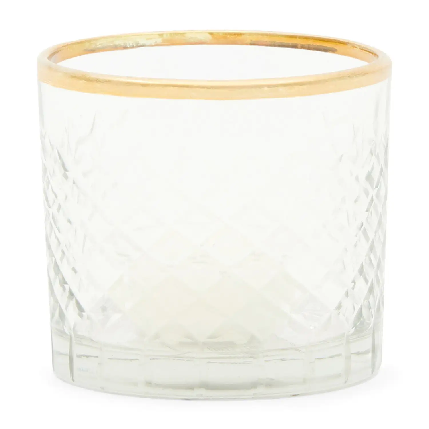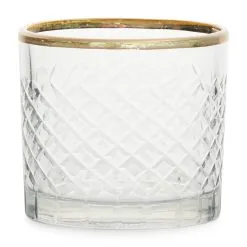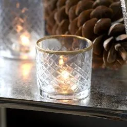 The tealight holder in this diamond-shaped glass is very special. The rim at the top contains real gold – not something you come across every day! When the light is lit, it gives a beautiful glow.