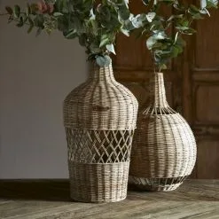 A fun decoration: a rustic rattan water bottle that will hold anything but water. Handmade with RM branding on a leather strap above the openwork section. Use it for dried branches and/or add some Christmas decoration to create a festive scene. Also available in other shapes and sizes.