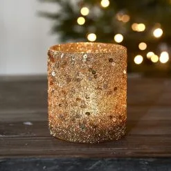 Illuminate your room with the Sassy Sequins tealight holder. This round, glass holder is intended for a tealight or a small candle and comes covered with lots of golden beads and spangles on the outside. Available in various sizes.