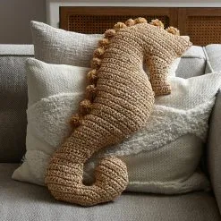 This stuffed cushion is shaped like a seahorse and is completely hand braided of dried strips of raffia. Why not combine this unusual pillow with other items with the seahorse theme.