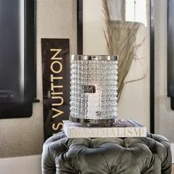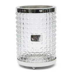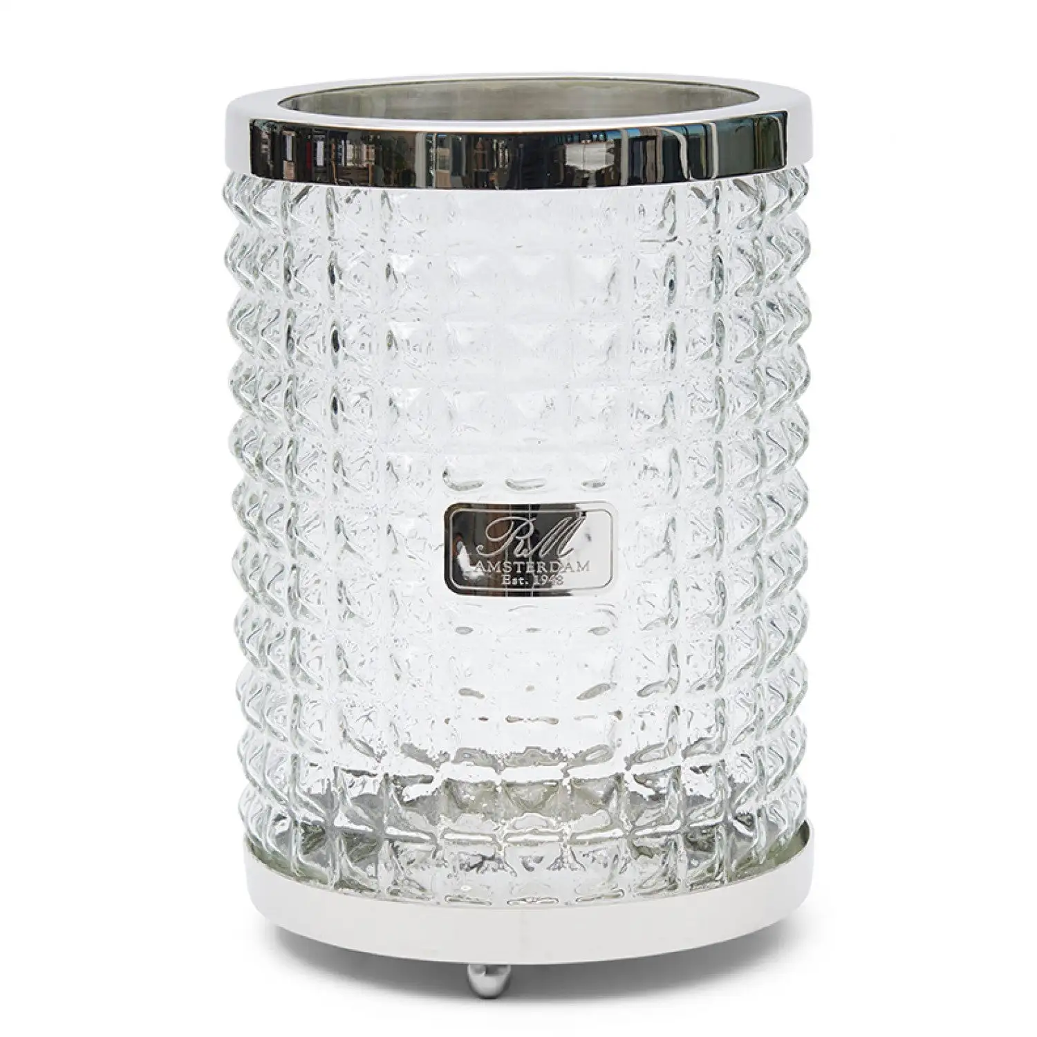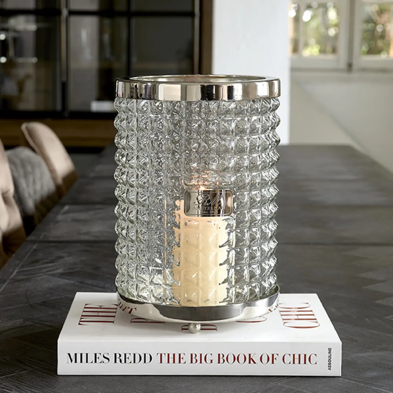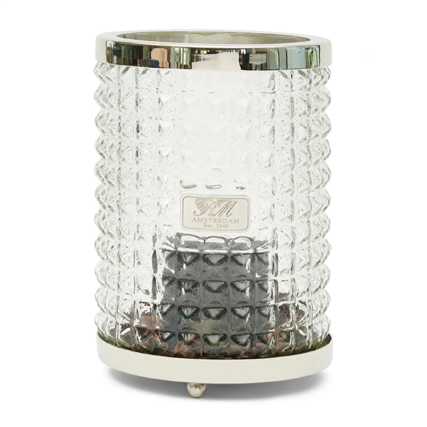 The glass of this windlight has been worked by hand so that the light gives a beautiful effect when the candle burns in it. The structured glass is finished with soft shiny metal and has a silver RM label.