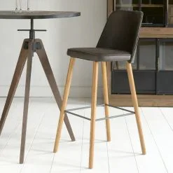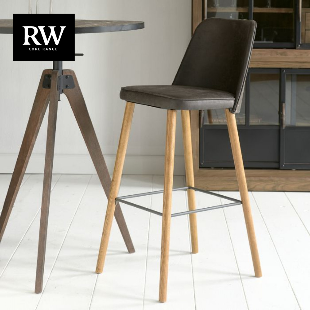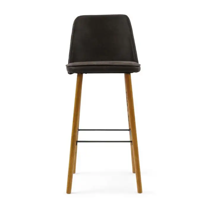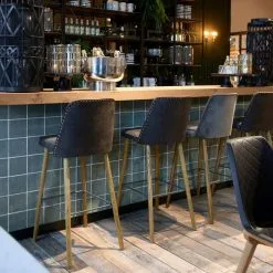 The Vegas Bar Stool is a comfortable seat with a retro look, thanks to its slender legs made from sustainable rubberwood and its carpeted pellini leather upholstery with gold-coloured decorative nails on the backrest. This chair comes in various versions, materials and colours.
