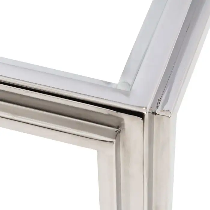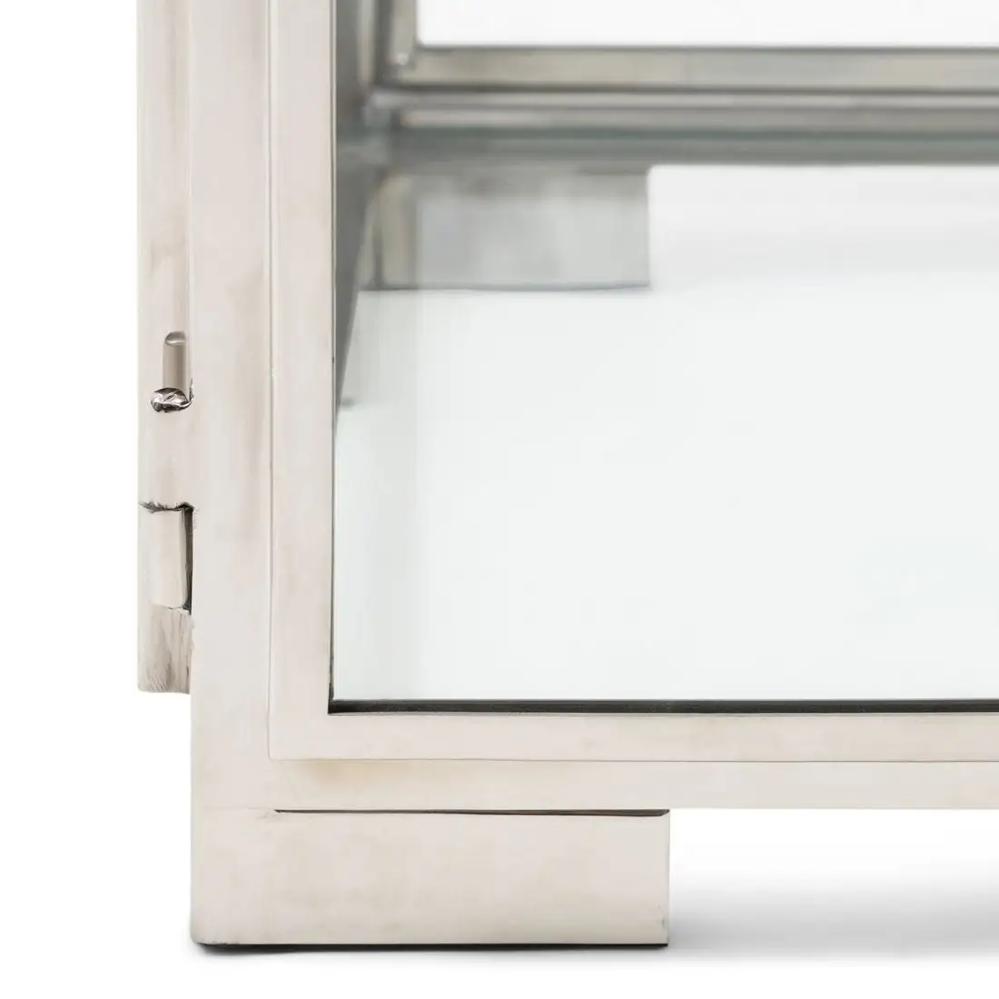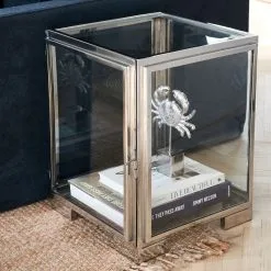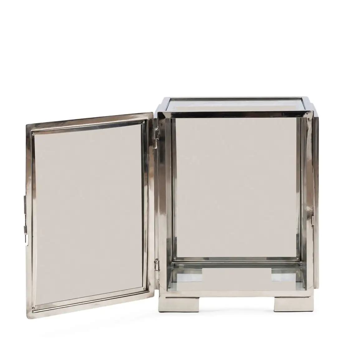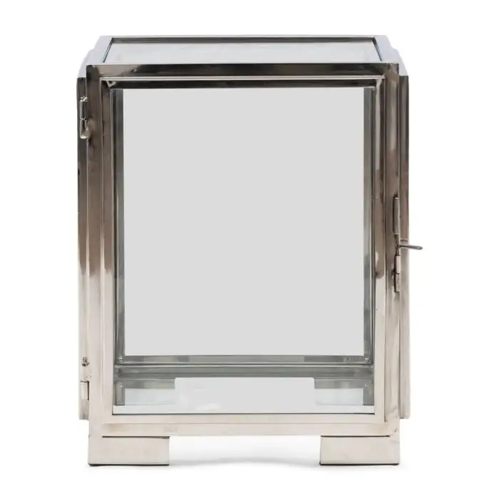 In small we call it a jewelery box, but in this size it is a nice side table. The door on the side can be opened, so that you can place special items in the table. The frame is made of shiny stainless steel, as are the frames and feet.