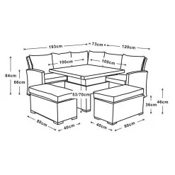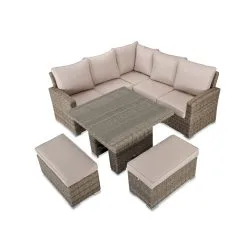 This RW Corner Rising Dining Set is perfect for relaxing with a cup of coffee or enjoying a meal. There is lots of seating room for you and your family with 2 footstools that double as ottomans as well as the corner sofa itself. This would look stunning on any decking or patio area.