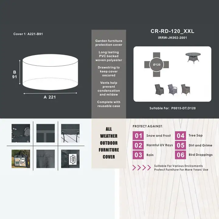 Protect your valuable outdoor furniture with one of these covers. Designed to protect against sun, wind, rain, frost, bird lime, sap and garden pests it’s made from 300 denier polyester and with double stitched seams for extra strength, the cover is designed to go completely over the furniture set, table and chairs and be tied down with the cords attached to ensure it is secure.
