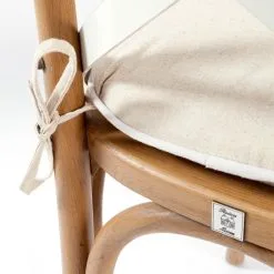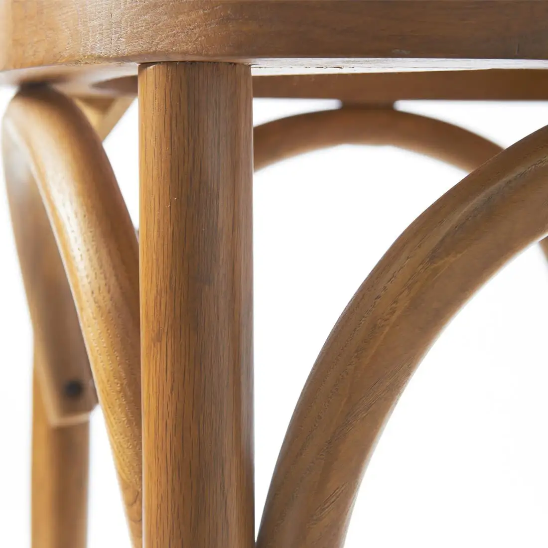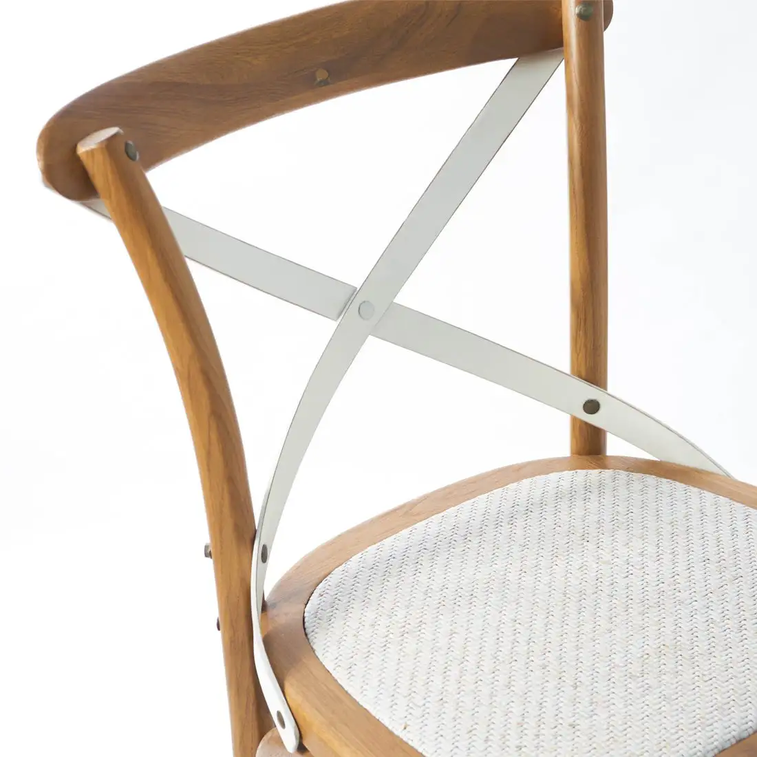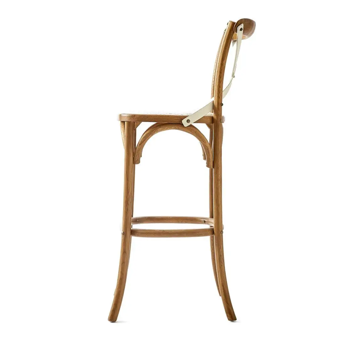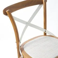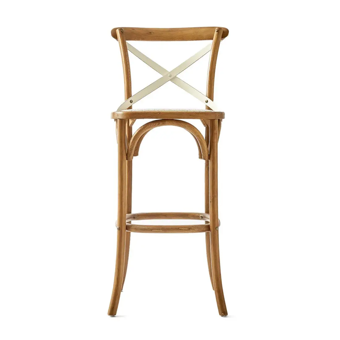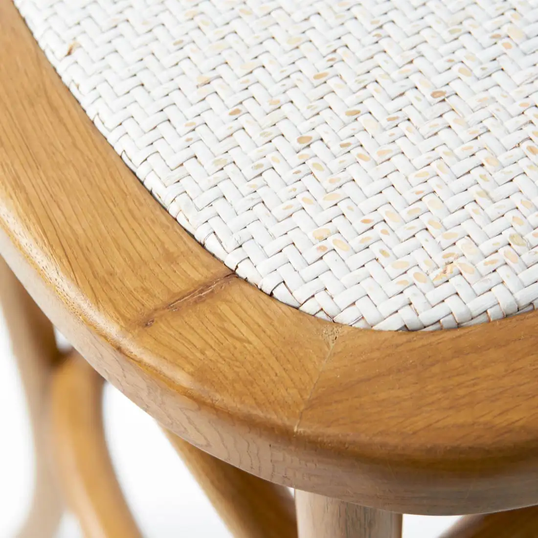 Oak barstool with crossed back support and woven seat; matching seat cushion available for extra comfort.