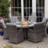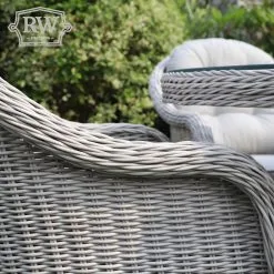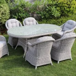 The Oval table and high, rounded backs to the chairs in this set, sets it apart from the norm. The chairs are as comfortable as they are stylish and come with soft, fat seat and back cushions and the table is deceptive as it easily seats 6 and comes with a built-in Lazy Susan (not illustrated) as well as a hole to take a parasol on very hot and sunny days.