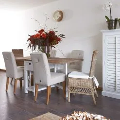 A hand-woven dining chair made of natural material. The grey colour is created by a natural process: as a result, the colour may vary slightly per item, which means that each piece of furniture is unique. The covers are made of 100% cotton.