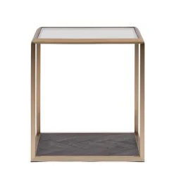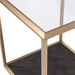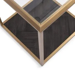 The Stanton End Table is not your typical end table. The chic end table is made of stainless steel in soft gold with a table top made of hardened glass. The bottom shelf of the table is made of dark oak in an inlaid herringbone pattern. A true eye-catcher for your interior! The Stanton range also features a coffee table.