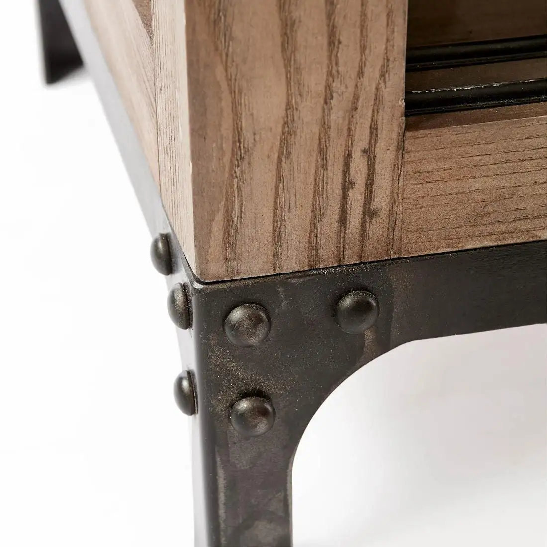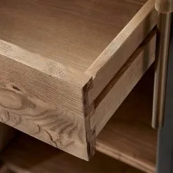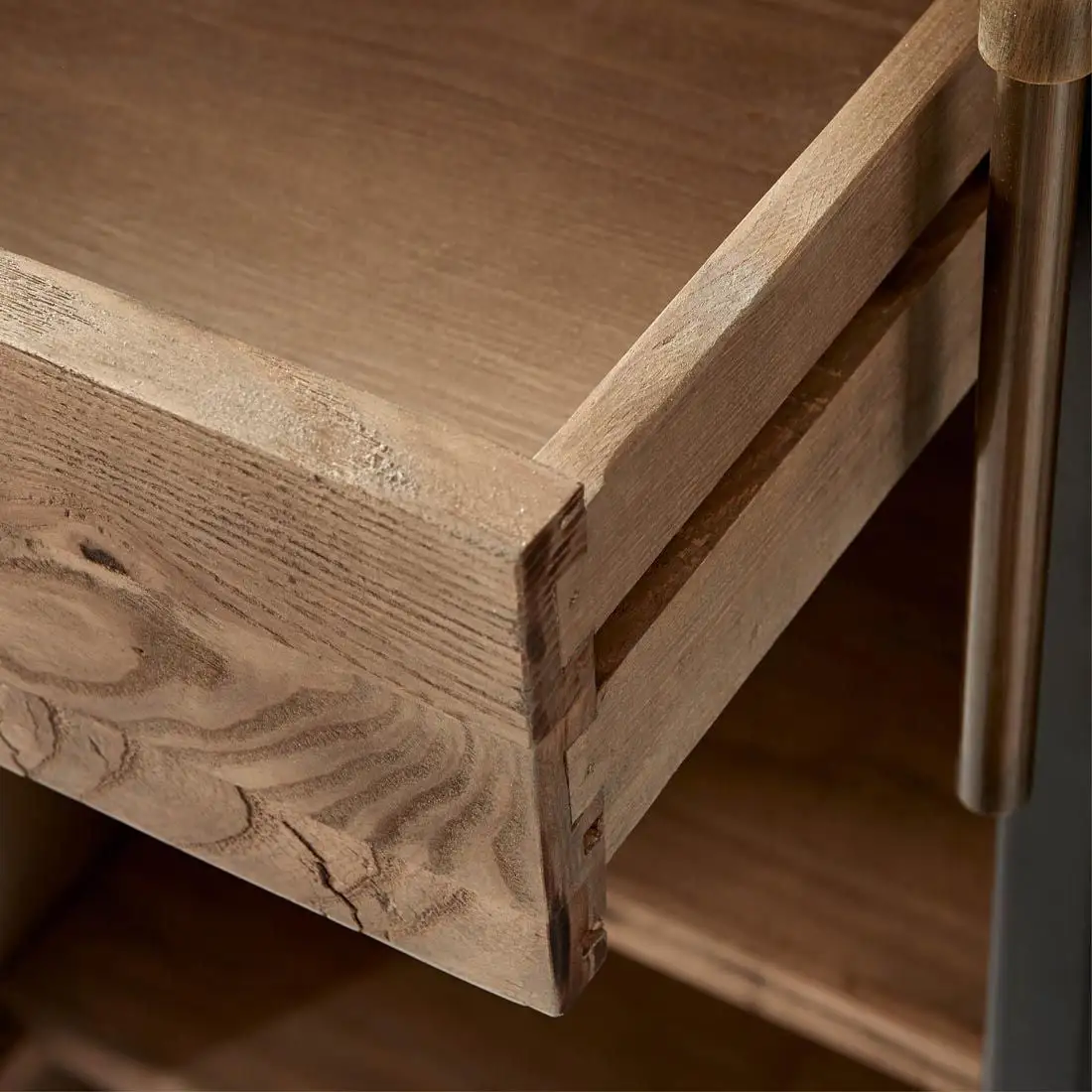 The Hoxton Cabinet is industrial yet warm due to the combination of recycled ash wood and metal. The metal doors slide open with the sturdy bars on the sides of the doors. The many shelves in the cabinet offer plenty of storage space, in the middle of the cabinet also two drawers for all your loose items.