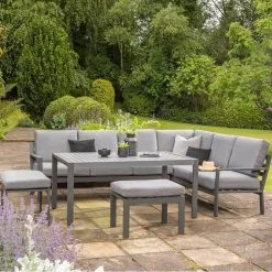 The Titchwell Corner Lounge Dining Set in Grey creates a luxurious experience using contemporary materials for the perfect deep seating outdoor furniture. This popular aluminium corner sofa dining set is both stylish and comfortable and combines a beautiful grey aluminium with luxurious ‘All season’ cushions which are a mix of acrylic and polyester with a full inner waterproof coating. This L Shape garden furniture set not only looks great but is highly durable and low maintenance. This stunning rust-resistant metal patio lounge dining set will comfortably seat up to 7 people.