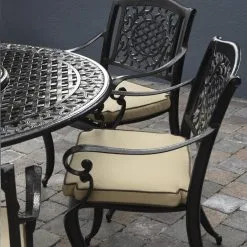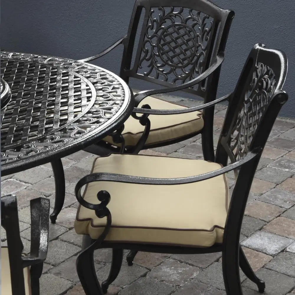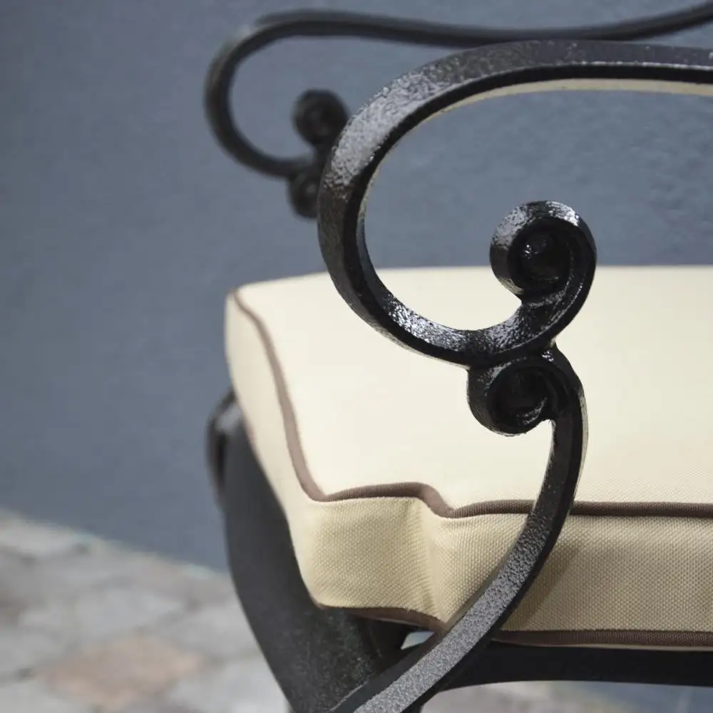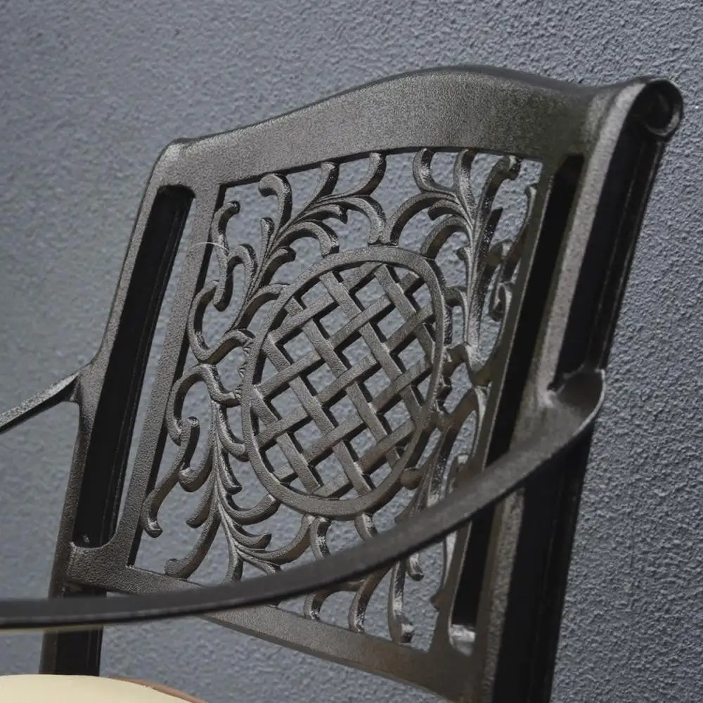 It is made from cast aluminium with a highly attractive hammered bronze finish and is complete with cream set cushions. It needs little or no maintenance and is completely rust-free! The chairs stack making them convenient for storage and the cushion covers are machine washable.