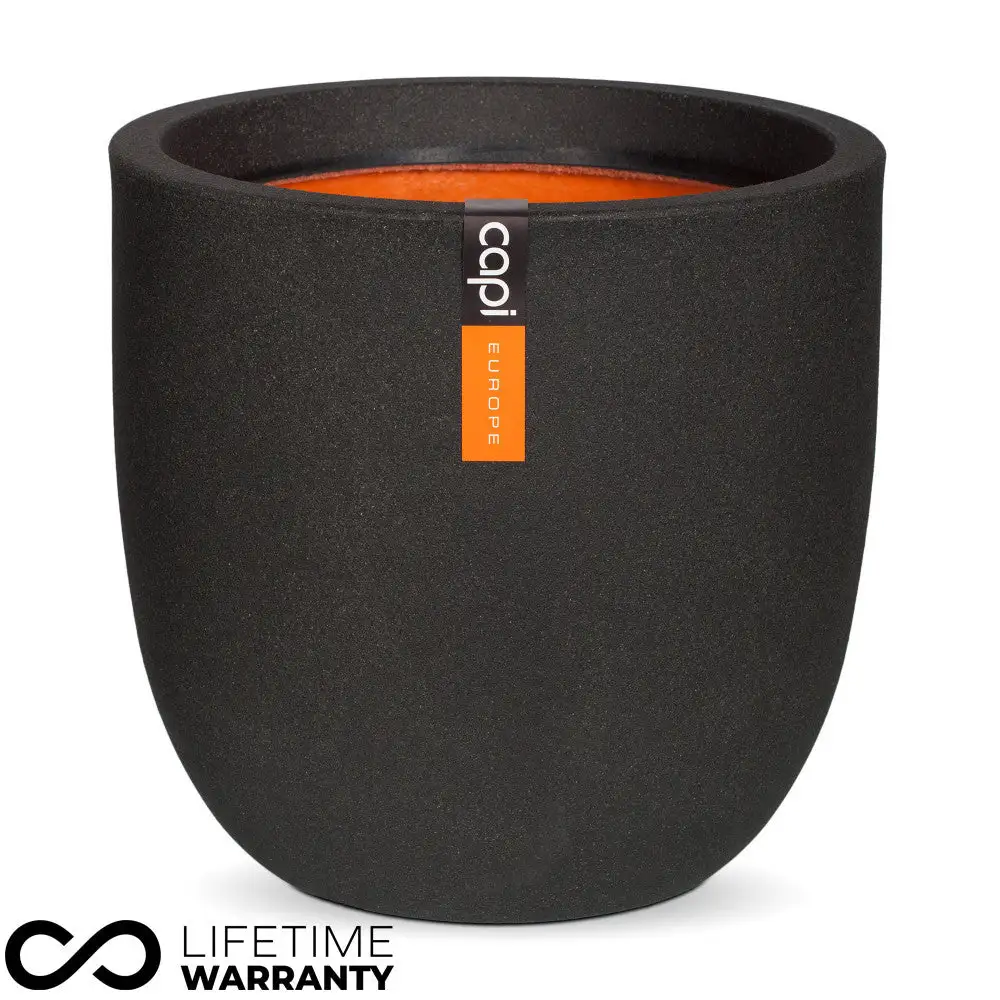 Made in Holland from 100% recycled plastic, the body has a texture reminiscent of rough, natural stone. It has a double walled design which insulates the roots of any plant in it and this together with its UV, frost and break resistance makes it ideal for use outdoors as well as in. When using outdoors however a hole the size of a 2 euro or 20p piece should be drilled in the base to allow drainage. For the best results it is recommended the bottom 1/3 of the planter is filled with hydro granules as these make for better water management.