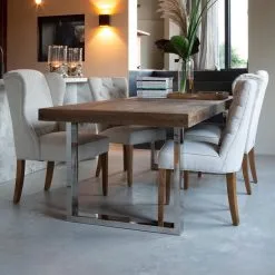 The Washington dining table is a robust dining table with a thick tabletop of old elm wood. This type of wood looks a bit like washed up wood, because of its coarse structure and greyish glow. Again and again you will enjoy sitting at this dining table. The shiny, wide base reinforces the sturdy character of the dining table.
