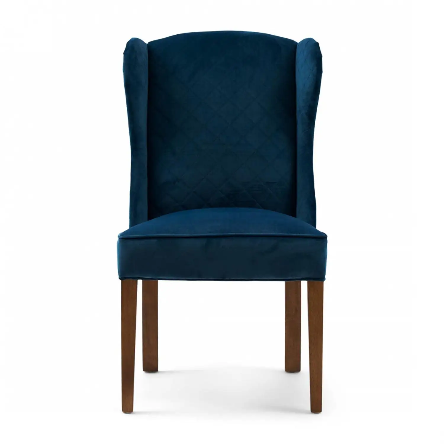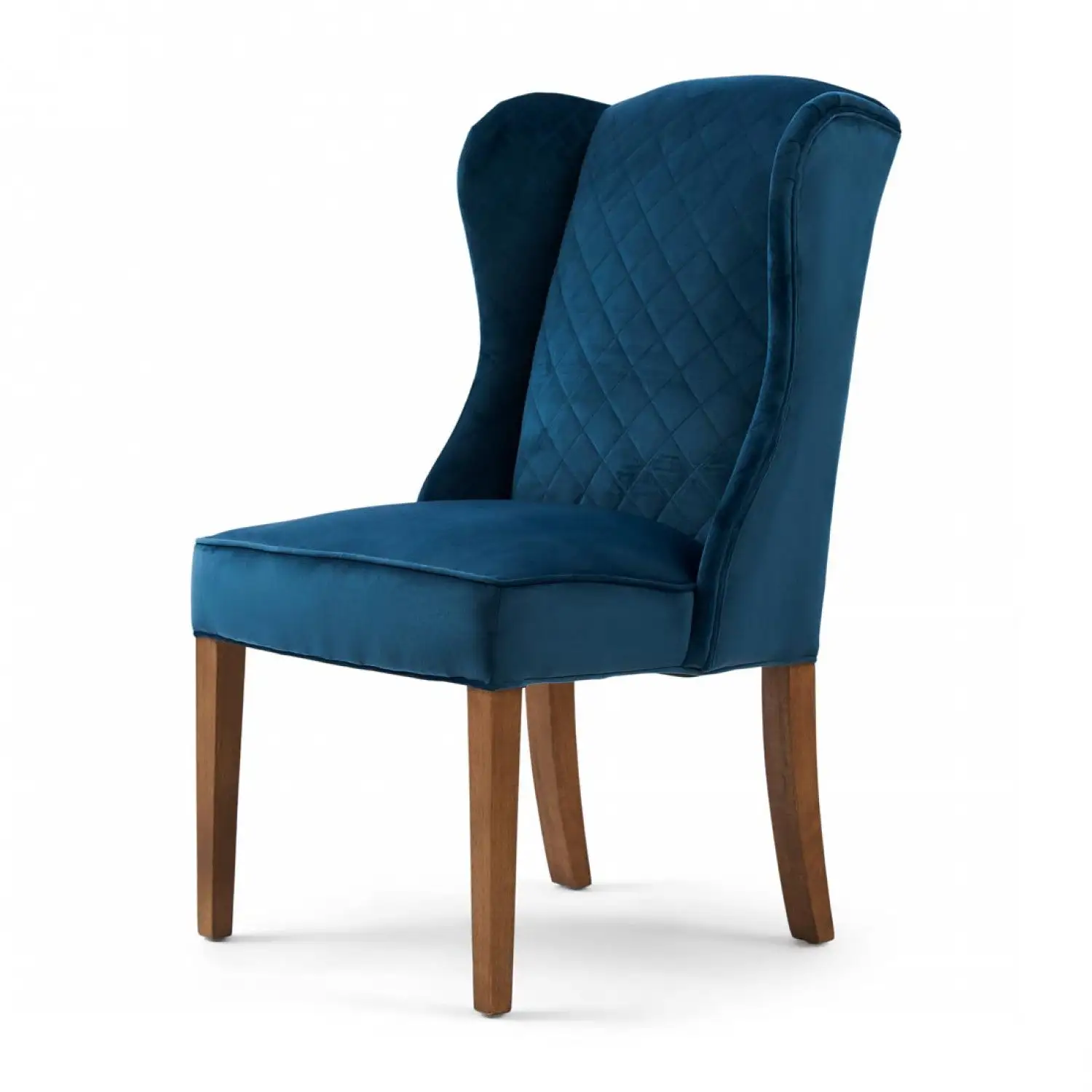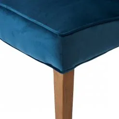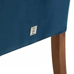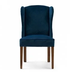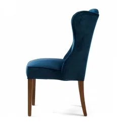 These dining chairs are available in slate grey and ocean blue. Made of responsible rubberwood and polyester velvet. The somewhat higher back has side supports to rest your head against. But not during that cosy meal when everyone wants to have the final word and is jumping enthusiastically on their chair. Don’t worry, the legs can withstand this.