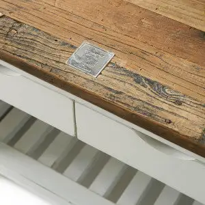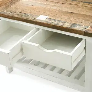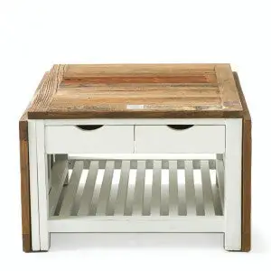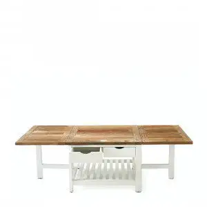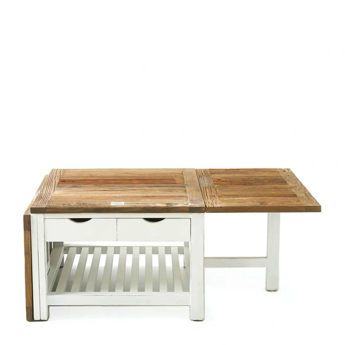 The tabletops are made of Driftwood: old shed doors made of elm wood.Both ends of the tabletop fold in and out easily to suit people living in a limited space.