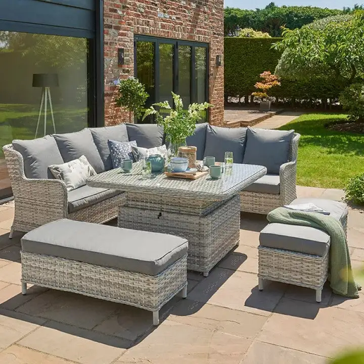 Flexible modular set which brings the sense of indoor comfort outside. A manually adjustable table transforms daytime relaxing into alfresco dining, with bench stools for added seating that can be used independently. Made in UV Resistant All-Weather Wide Weave over an aluminium frame in a contemporary blended grey.
