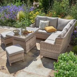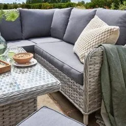 The Wroxham Mini Corner Set creates a luxurious experience using contemporary materials for the perfect outdoor dining set. This superb rattan corner dining set is both stylish and comfortable and combines a beautiful grey wide rattan weave with luxurious ‘All season’ cushions which are a mix of acrylic and polyester with a full inner waterproof coating. This garden furniture set not only looks great but is highly durable and low maintenance.
